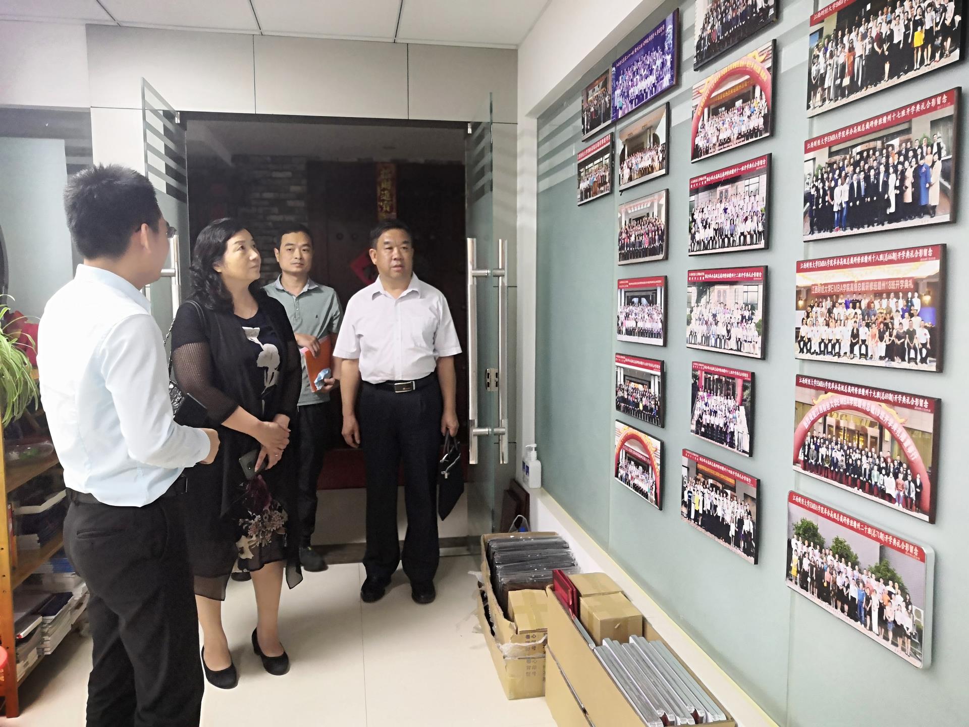 在江西财经大学工商管理学院EDP中心赣州教学点主任、赣州市江西财经大学EMBA同学联谊会党支部书记易永的陪同和介绍下,杨小妹书记一行参观了财大EMBA赣州总裁班各班开学典礼合影、历届总裁新春年会合影、财大EMBA总裁班师资专栏和财大EMBA同学联谊会党支部活动专栏,了解江西财大工商管理学院EDP中心赣州教学点的基本情况、开班教学情况以及同学联谊会党支部自成立以来所开展的活动情况。